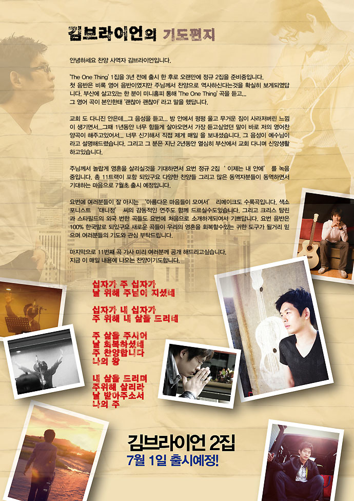 찬양 사역자 김브라이언의 2번째 앨범이 곧 출시예정인데요, 한참 앨범마무리 작업중인 그가 직접 쓴 기도편지를 보내왔습니다. 아직은 서툰 한글맞춤법이지만 그의 진심이 묻어난 글이 느껴지네요, 함께 나누면서 곧 출시 예정인 김브라이언 2집을 위해서 많은 기도와 관심을 부탁합니다~