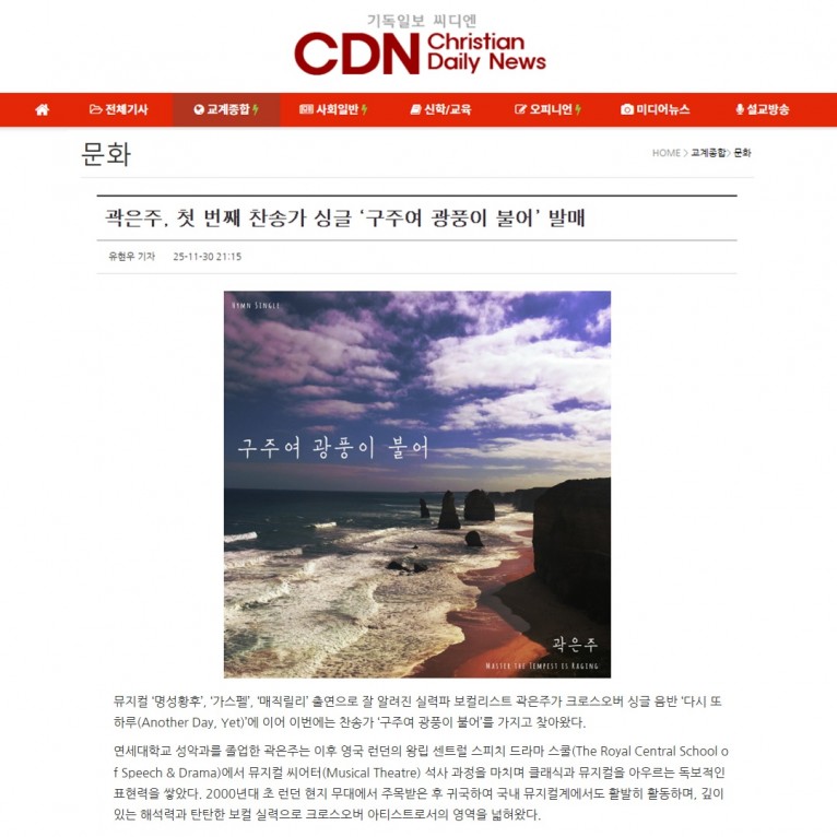 [기사] 곽은주, 첫 번째 찬송가 싱글 ‘구주여 광풍이 불어’ 발매(기독일보 씨디엔)