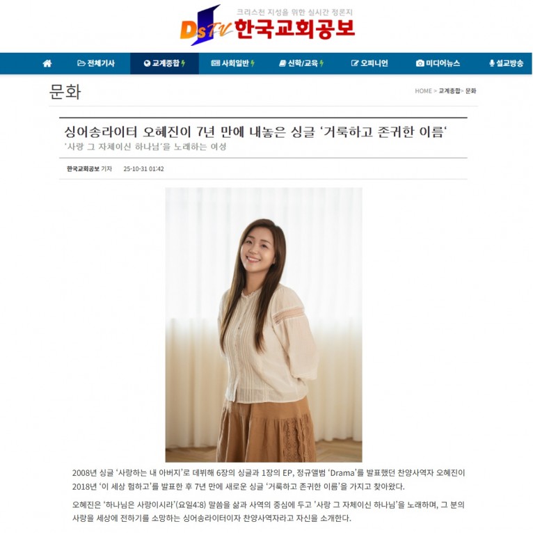 뮤직타임 [기사] 싱어송라이터 오혜진이 7년 만에 내놓은 싱글 ‘거룩하고 존귀한 이름‘(한국교회공보)