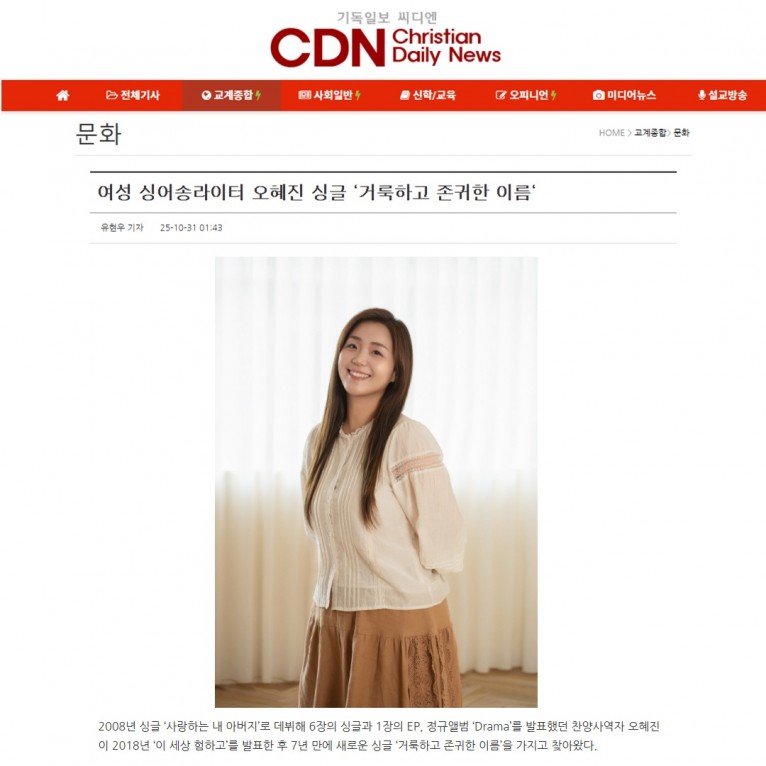 뮤직타임 [기사] 여성 싱어송라이터 오혜진 싱글 ‘거룩하고 존귀한 이름‘(기독일보 씨디엔)