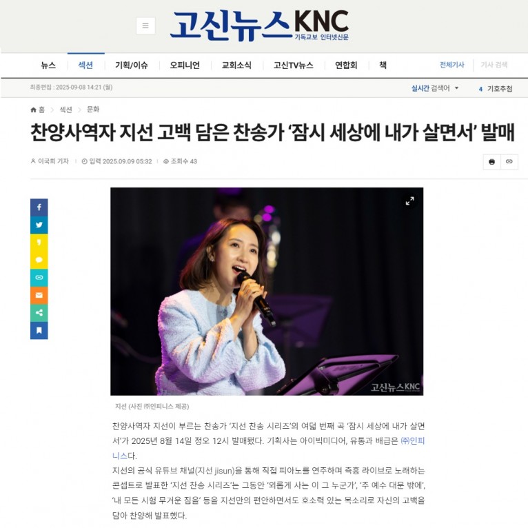 [기사] 찬양사역자 지선 고백 담은 찬송가 ‘잠시 세상에 내가 살면서’ 발매(고신뉴스 KNC)