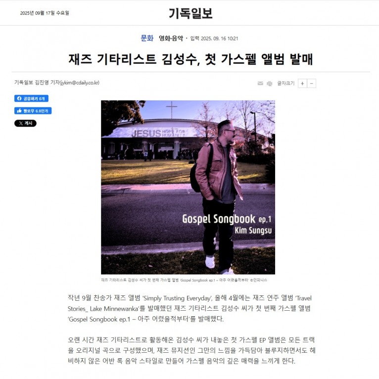 [기사] 재즈 기타리스트 김성수, 첫 가스펠 앨범 발매(기독일보)