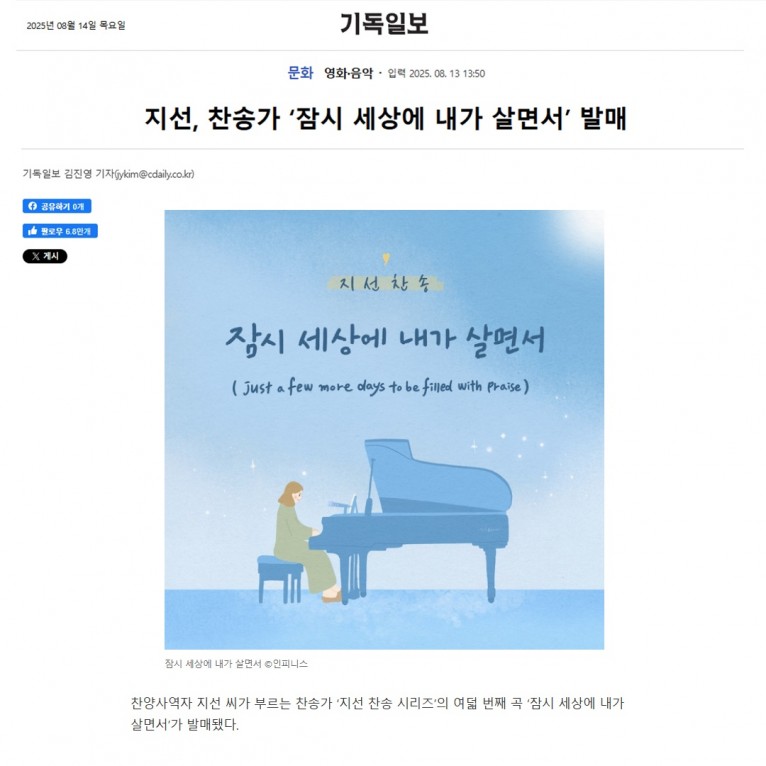 뮤직타임 [기사] 지선, 찬송가 ‘잠시 세상에 내가 살면서’ 발매(기독일보)