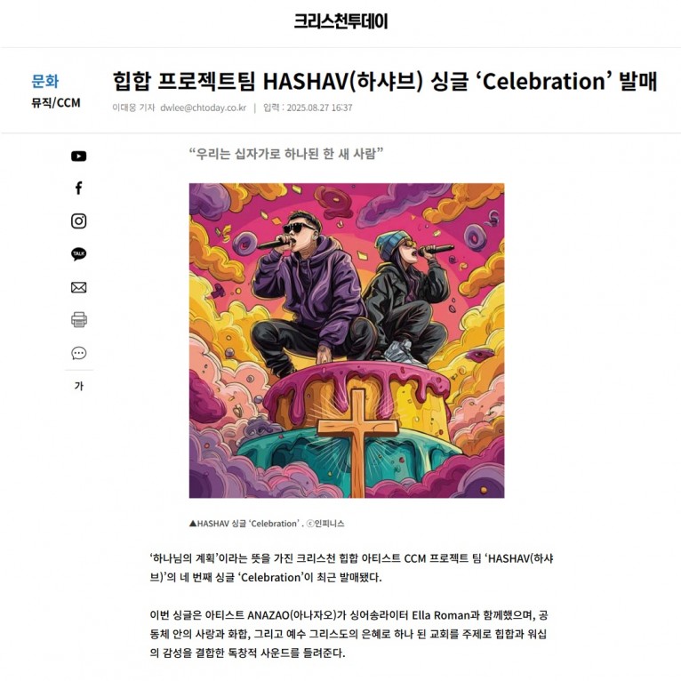 [기사] 힙합 프로젝트팀 HASHAV(하샤브) 싱글 ‘Celebration’ 발매(크리스천투데이)