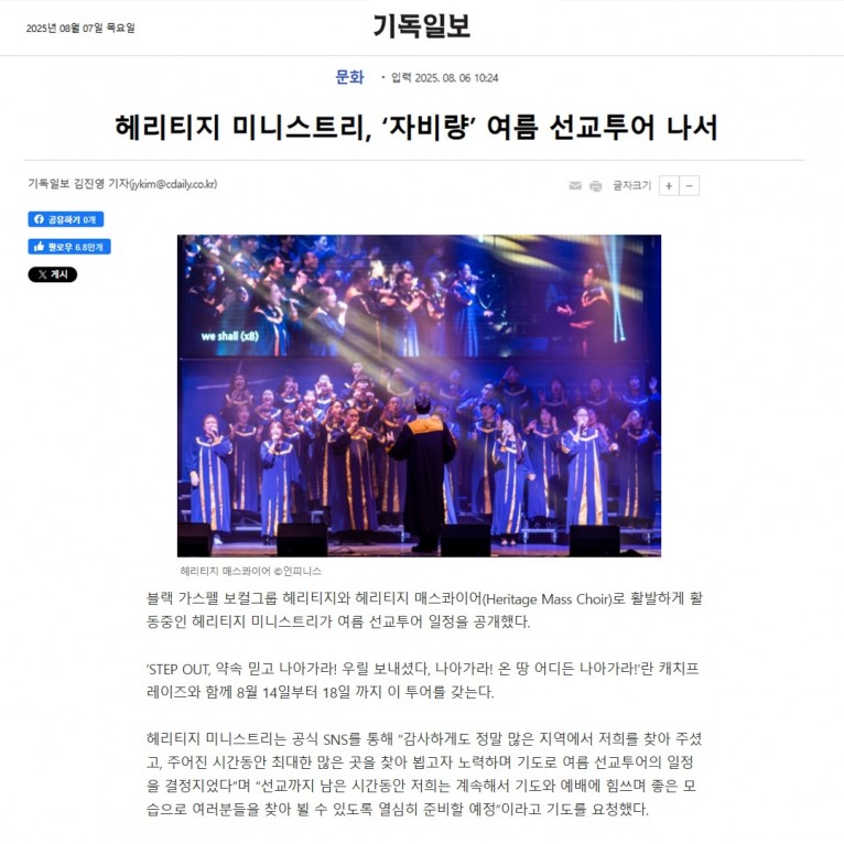 블랙 가스펠 보컬그룹 헤리티지와 헤리티지 매스콰이어(Heritage Mass Choir)로 활발하게 활동중인 헤리티지 미니스트리가 여름 선교투어 일정을 공개했다.