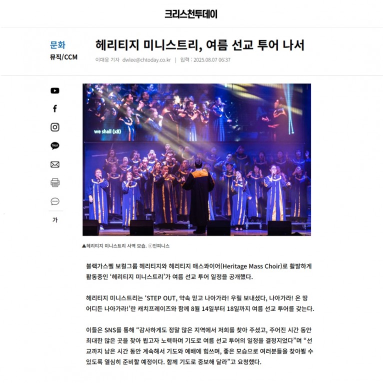 뮤직타임 [기사] 헤리티지 미니스트리, 여름 선교 투어 나서(크리스천투데이)