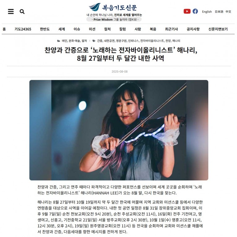 [기사] 찬양과 간증으로 ‘노래하는 전자바이올리니스트’ 해나리, 8월 27일부터 두 달간 내한 사역(복음기도신문)