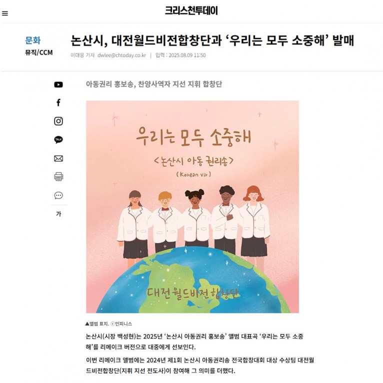 뮤직타임 [기사] 논산시, 대전월드비전합창단과 ‘우리는 모두 소중해’ 발매(크리스천투데이)