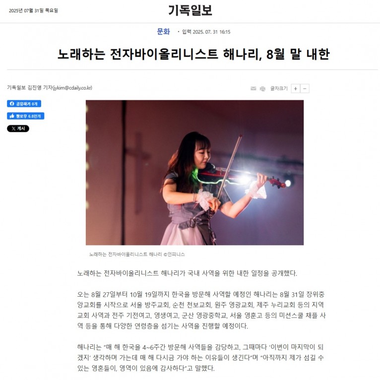 [기사] 노래하는 전자바이올리니스트 해나리, 8월 말 내한(기독일보)