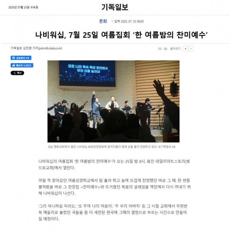 [기사] 나비워십, 7월 25일 여름집회 '한 여름밤의 찬미예수'(기독일보)