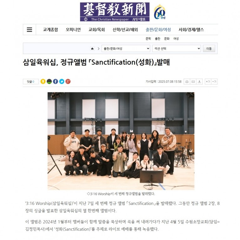 [기사] 삼일육워십, 정규앨범 「Sanctification(성화)」발매(기독교신문)