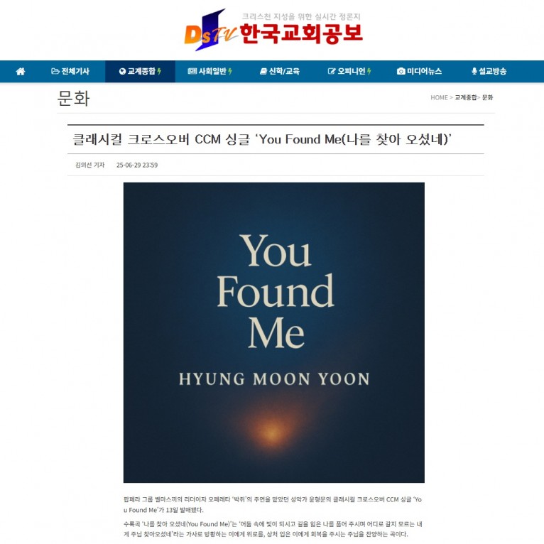 [기사] 클래시컬 크로스오버 CCM 싱글 ‘You Found Me(나를 찾아 오셨네)’(한국교회공보)