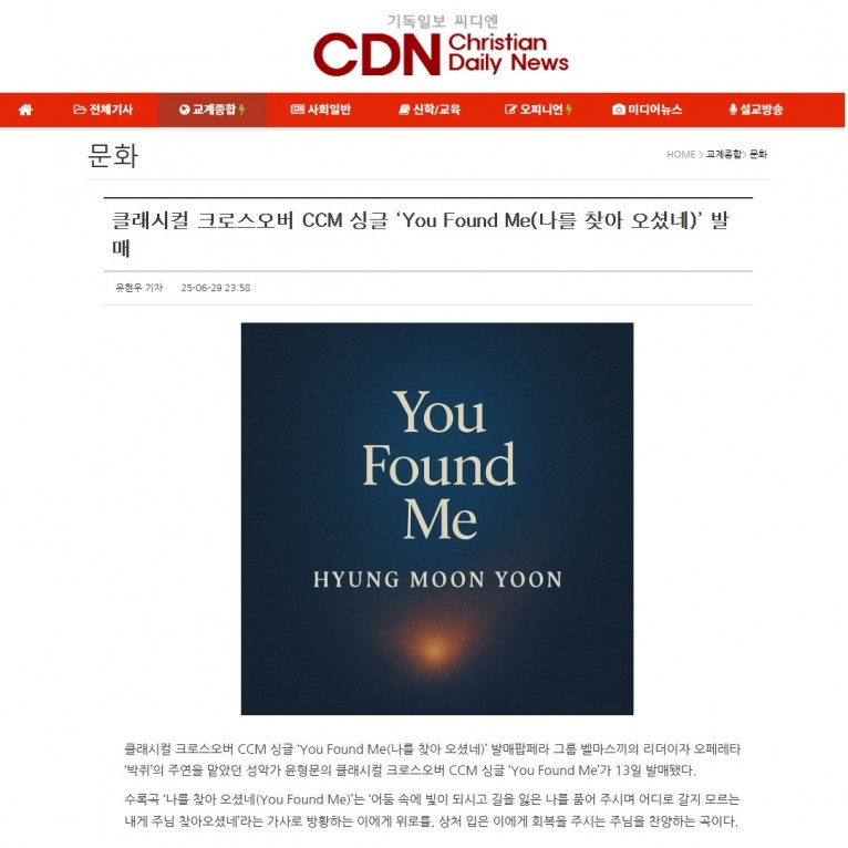뮤직타임 [기사] 클래시컬 크로스오버 CCM 싱글 ‘You Found Me(나를 찾아 오셨네)’ 발매(기독일보 씨디엔)
