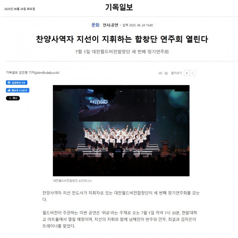 [기사] 찬양사역자 지선이 지휘하는 대전월드비전합창단 연주회 열린다(기독일보)