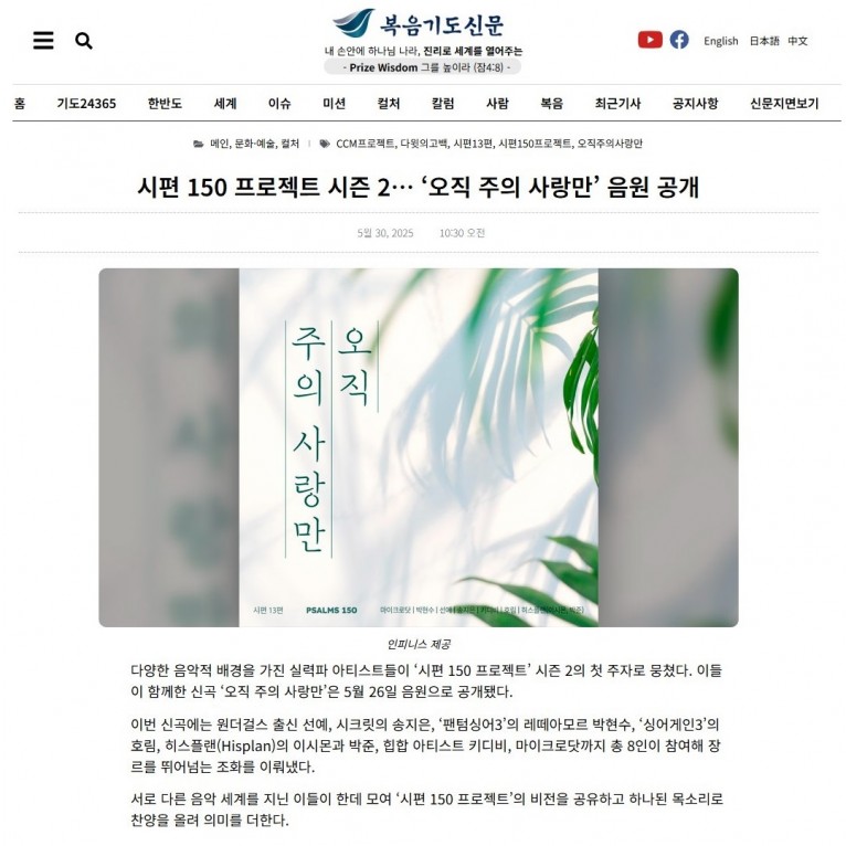 [기사] 시편 150 프로젝트 시즌 2… ‘오직 주의 사랑만’ 음원 공개(복음기도신문)