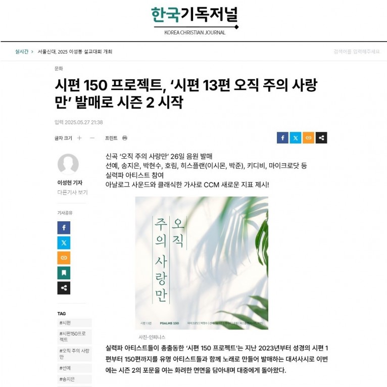 [기사] 시편 150 프로젝트, ‘시편 13편 오직 주의 사랑만’ 발매로 시즌 2 시작(한국기독저널)