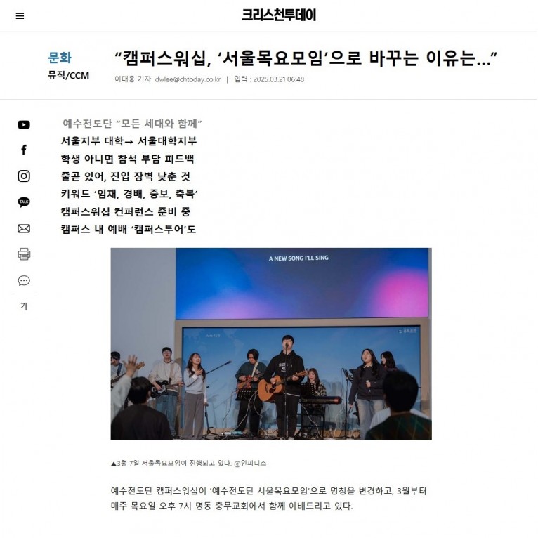 뮤직타임 [기사] “캠퍼스워십, ‘서울목요모임’으로 바꾸는 이유는…”(크리스천투데이)