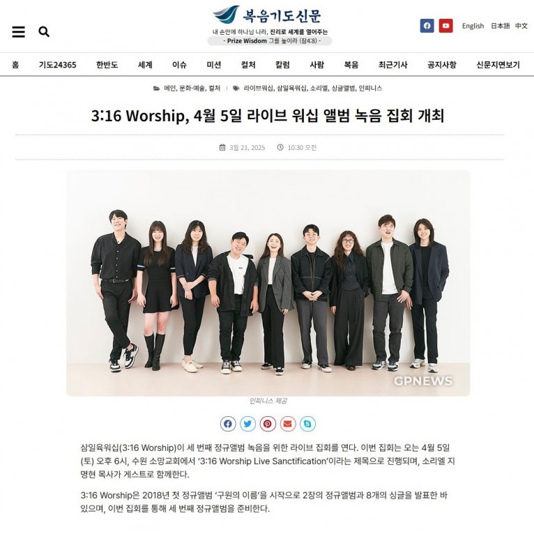 뮤직타임 [기사] 3:16 Worship, 4월 5일 라이브 워십 앨범 녹음 집회 개최(복음기도신문)