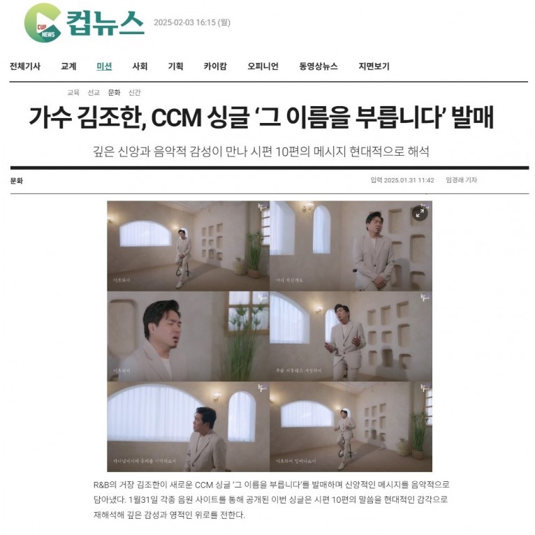 뮤직타임 [기사] 가수 김조한, CCM 싱글 ‘그 이름을 부릅니다’ 발매(크리스챤연합신문)