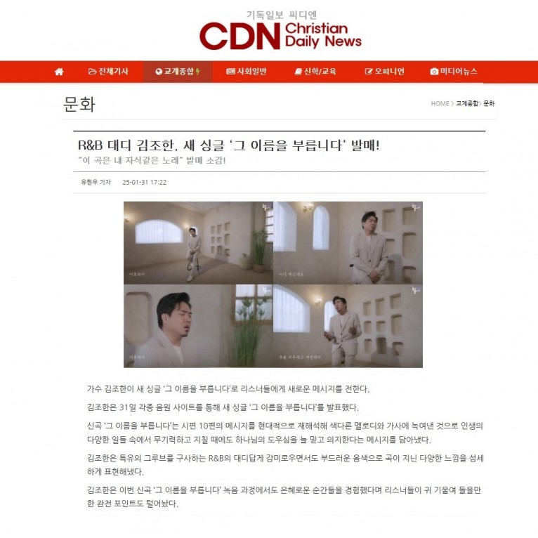 [기사] R&B 대디 김조한, 새 싱글 ‘그 이름을 부릅니다’ 발매!(기독일보 씨디엔)