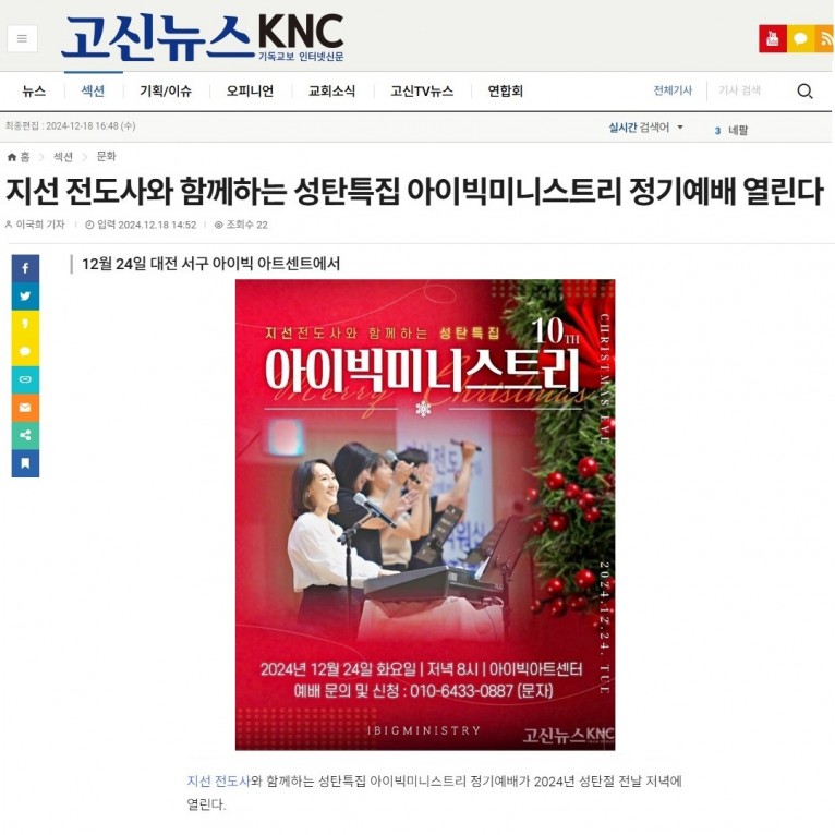 [기사] 지선 전도사와 함께하는 성탄특집 아이빅미니스트리 정기예배 열린다(고신뉴스 KNC)