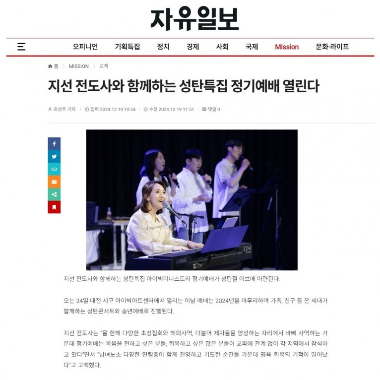 뮤직타임 [기사] 지선 전도사와 함께하는 성탄특집 정기예배 열린다(자유일보)