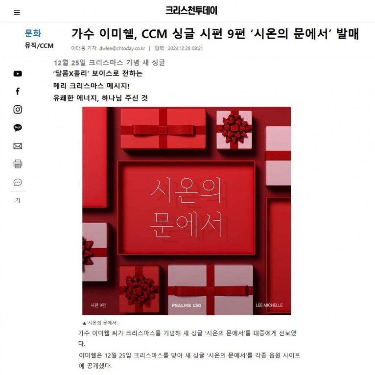 뮤직타임 [기사] 가수 이미쉘, CCM 싱글 시편 9편 ‘시온의 문에서’ 발매(크리스천투데이)