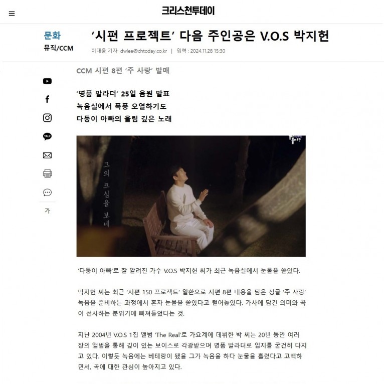 [기사] ‘시편 프로젝트’ 다음 주인공은 V.O.S 박지헌(크리스천투데이)