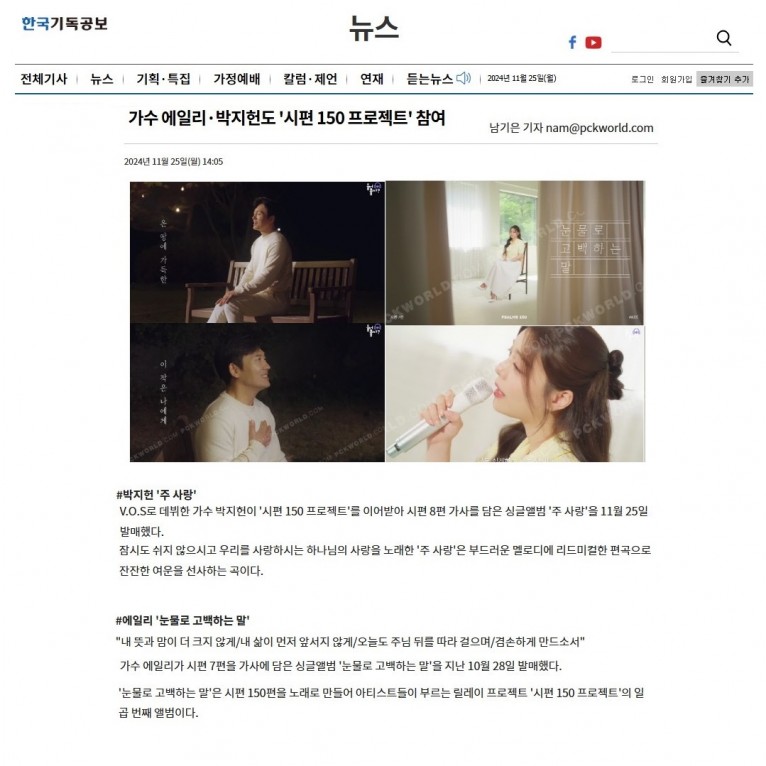 [기사] 가수 에일리·박지헌도 '시편 150 프로젝트' 참여(한국기독공보)