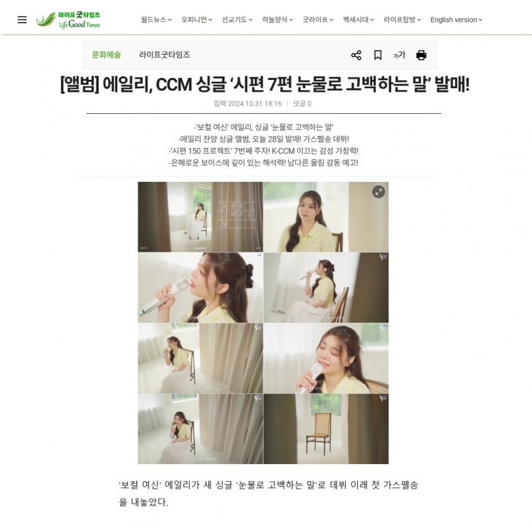 뮤직타임 [기사] 에일리, CCM 싱글 ‘시편 7편 눈물로 고백하는 말’ 발매!(라이프굿타임즈)