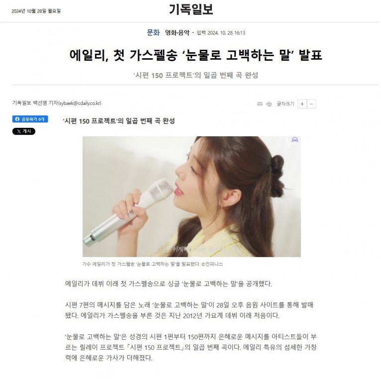 뮤직타임 [기사] 에일리, 첫 가스펠송 ‘눈물로 고백하는 말’ 발표(기독일보)