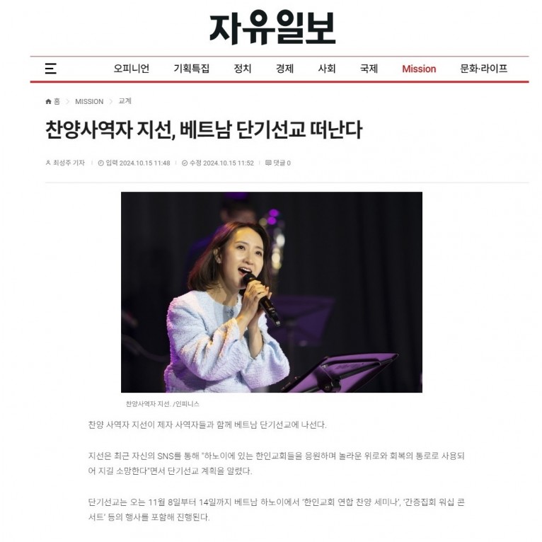 [기사] 찬양사역자 지선, 베트남 단기선교 떠난다(자유일보)