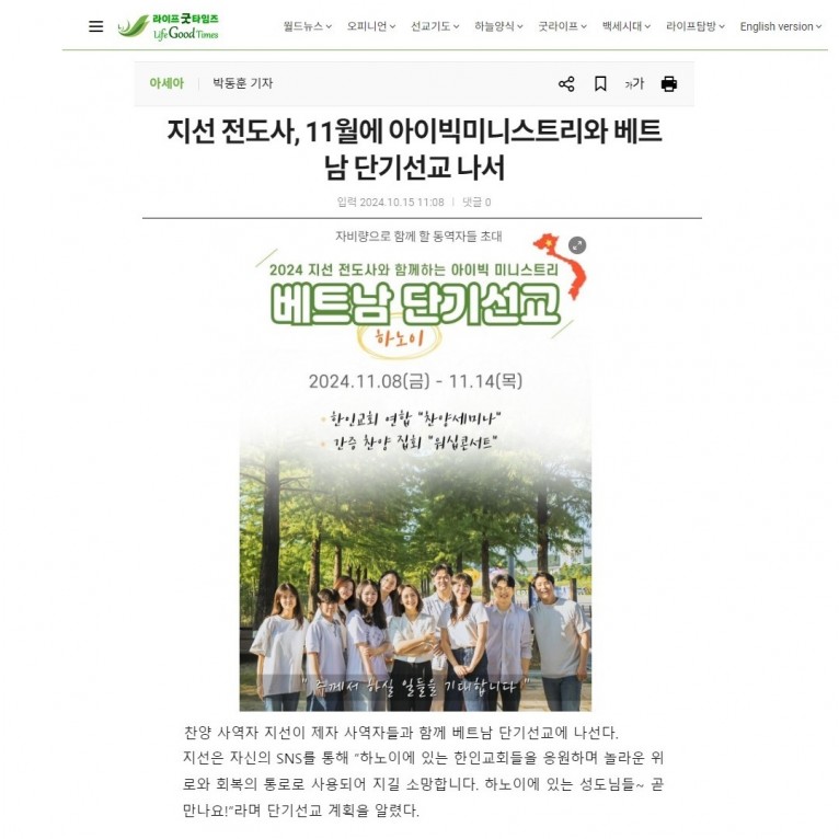 [기사] 지선 전도사, 11월에 아이빅미니스트리와 베트남 단기선교 나서(라이프굿타임즈)