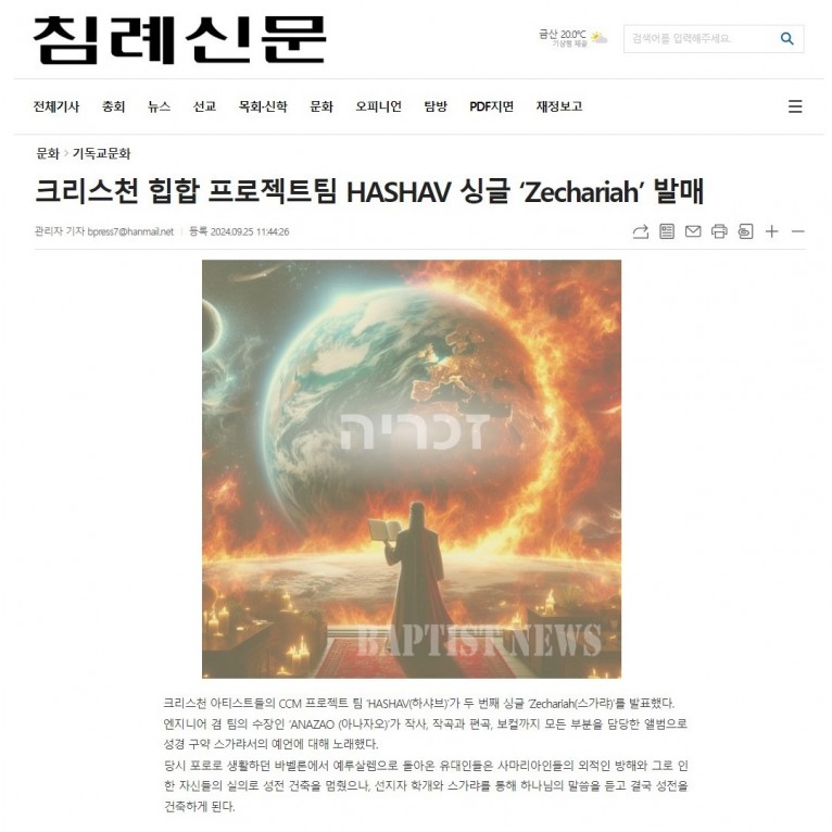 [기사] 크리스천 힙합 프로젝트팀 HASHAV 싱글 ‘Zechariah’ 발매(침례신문)