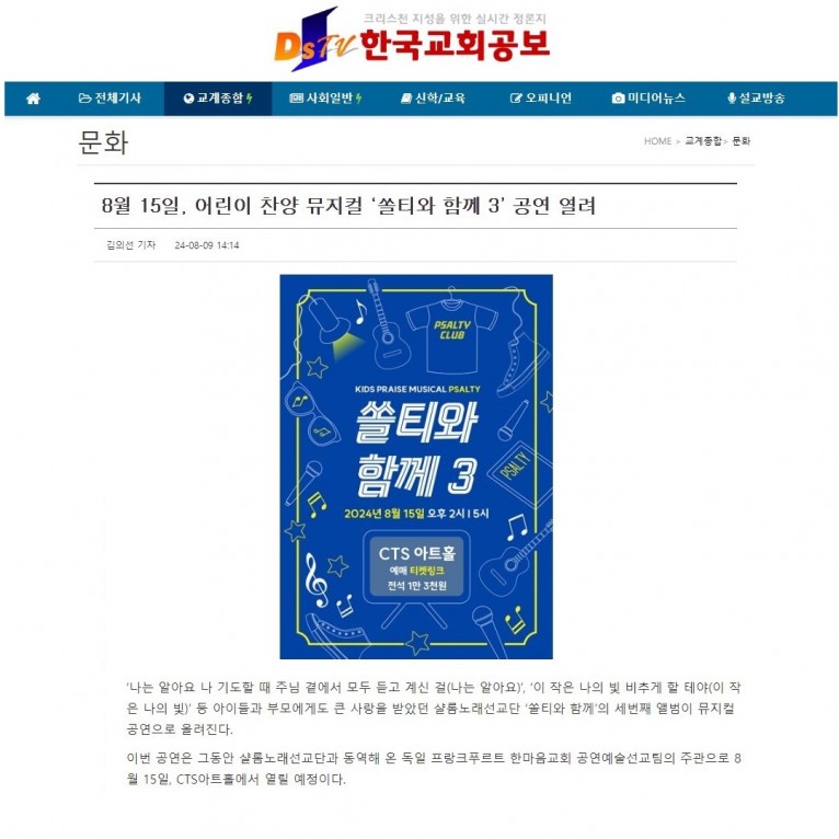 [기사] 8월 15일, 어린이 찬양 뮤지컬 ‘쏠티와 함께 3’ 공연 열려(한국교회공보)