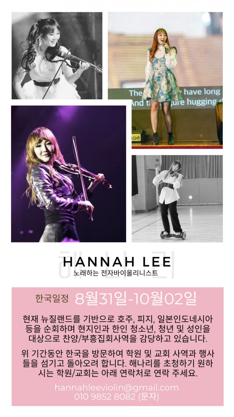 [보도자료] 뉴질랜드에서 사역중인 노래하는 전자바이올리니스트 해나리, 한국 사역위해 9월 내한