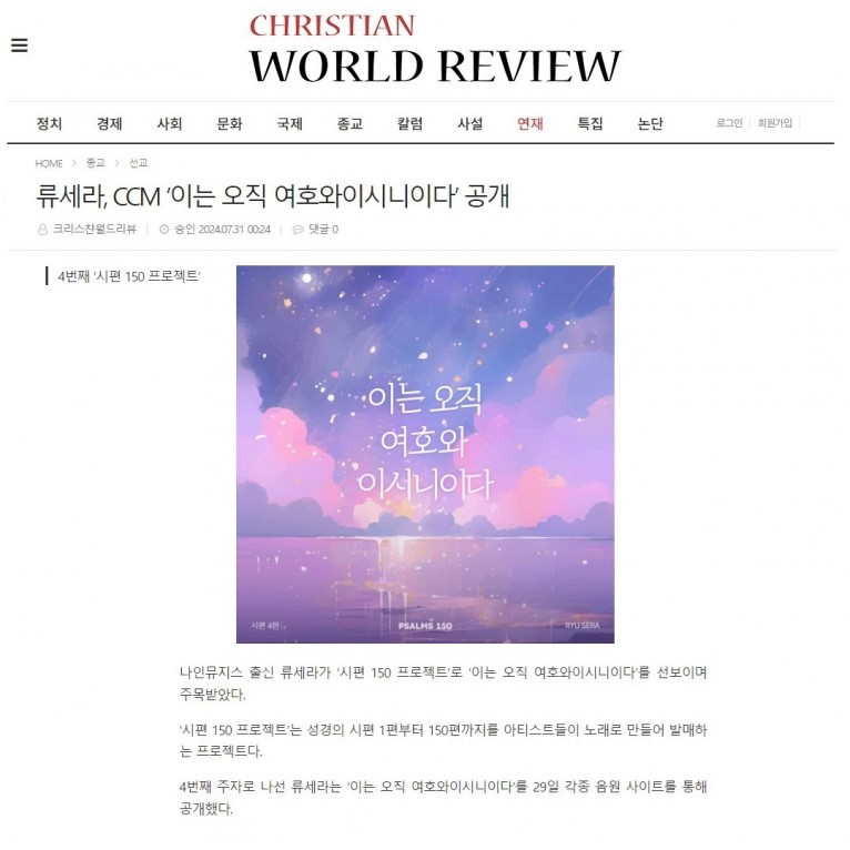 [기사] 류세라, CCM ‘이는 오직 여호와이시니이다’ 공개(크리스챤월드리뷰)