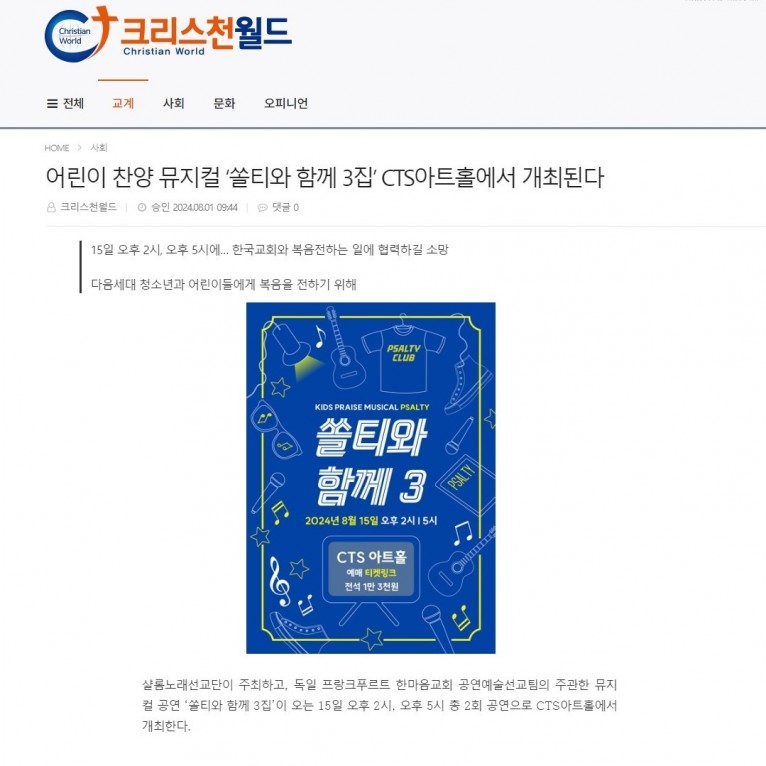 [기사] 어린이 찬양 뮤지컬 ‘쏠티와 함께 3집’ CTS아트홀에서 개최된다(크리스천월드)
