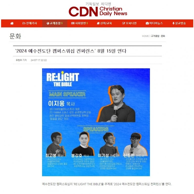 [기사] '2024 예수전도단 캠퍼스워십 컨퍼런스' 8월 15일 연다(기독일보 씨디엔)