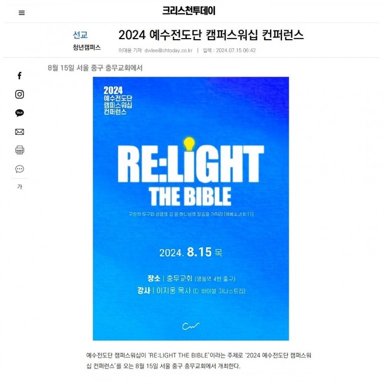 예수전도단 캠퍼스워십이 ‘RE:LIGHT THE BIBLE’이라는 주제로 ‘2024 예수전도단 캠퍼스워십 컨퍼런스’를 오는 8월 15일 서울 중구 충무교회에서 개최한다.