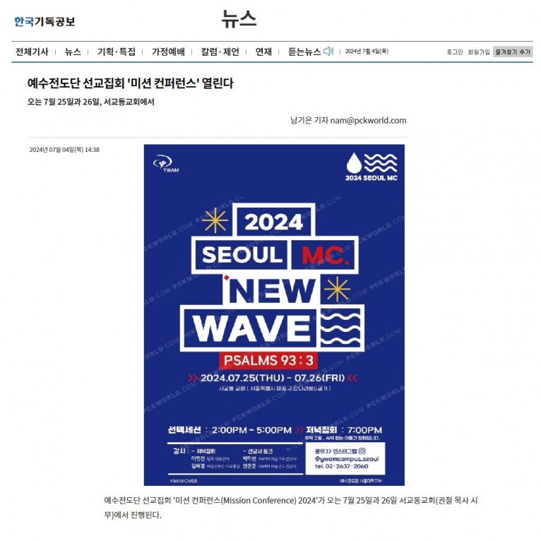 [기사] 예수전도단 선교집회 '미션 컨퍼런스' 열린다(한국기독공보)
