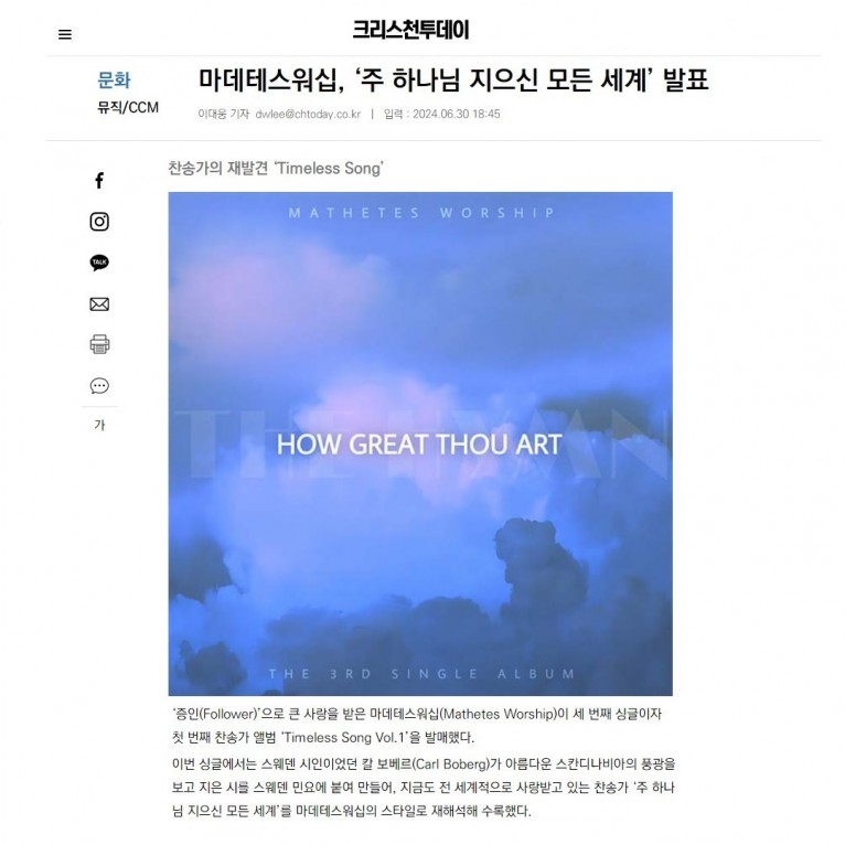 [기사] 마데테스워십, ‘주 하나님 지으신 모든 세계’ 발표 (크리스천투데이)