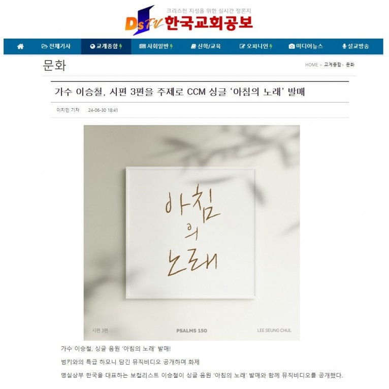 [기사] 가수 이승철, 시편 3편을 주제로 CCM 싱글 ‘아침의 노래’ 발매(한국교회공보)