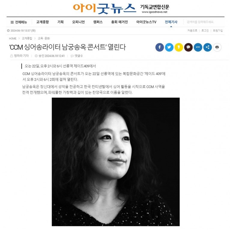 뮤직타임 [기사] ‘CCM 싱어송라이터 남궁송옥 콘서트’ 열린다(아이굿뉴스 기독교연합신문)