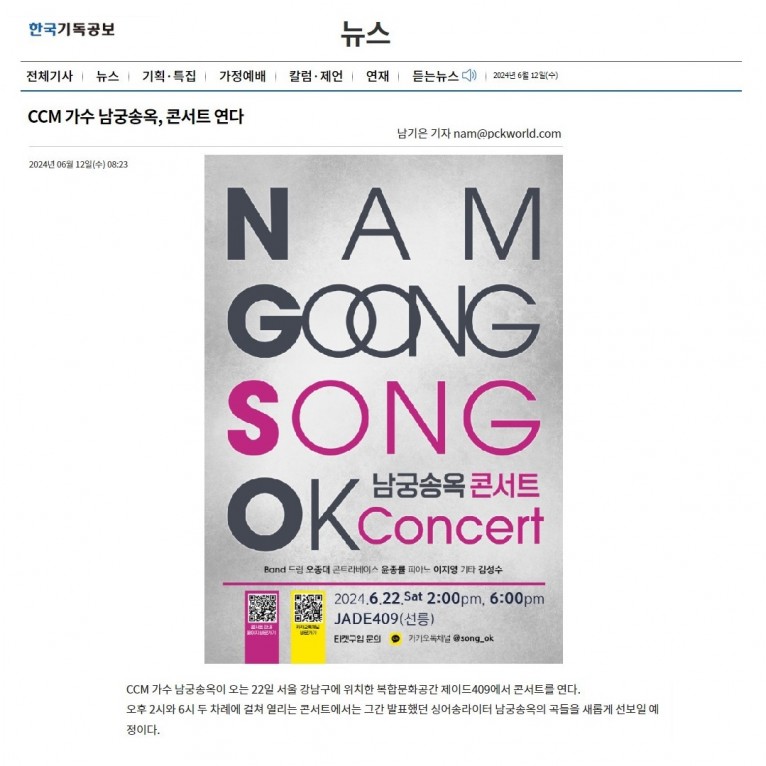 [기사] CCM 가수 남궁송옥, 콘서트 연다(한국기독공보)