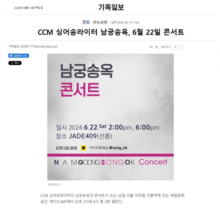 뮤직타임 [기사] CCM 싱어송라이터 남궁송옥, 6월 22일 콘서트(기독일보)
