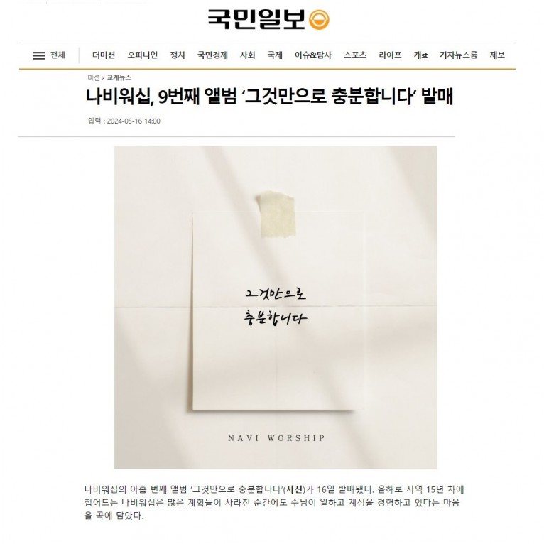 [기사] 나비워십, 9번째 앨범 ‘그것만으로 충분합니다’ 발매(국민일보)