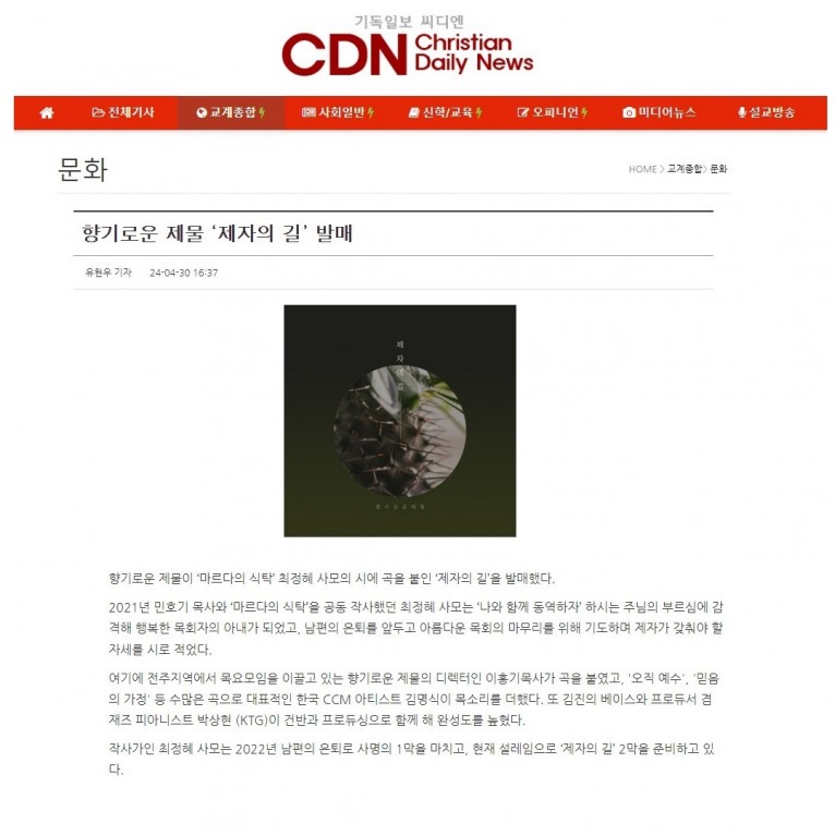 뮤직타임 [기사] 향기로운 제물 ‘제자의 길’ 발매(기독일보 씨디엔)