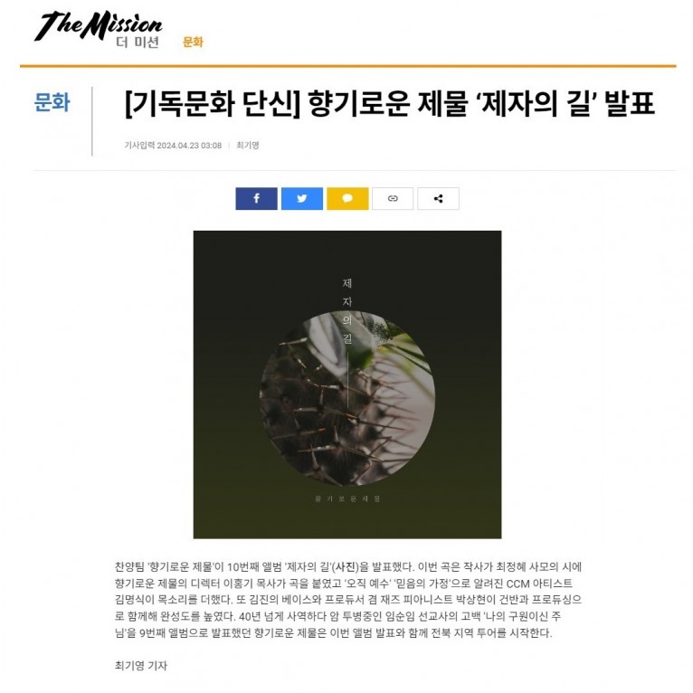 [기사] 향기로운 제물 ‘제자의 길’ 발표(국민일보 더미션)