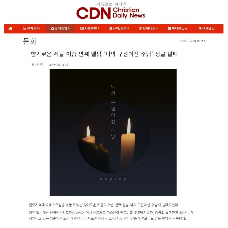 [기사] 향기로운 제물 아홉 번째 앨범 ‘나의 구원이신 주님’ 싱글 발매(기독일보 씨디엔)